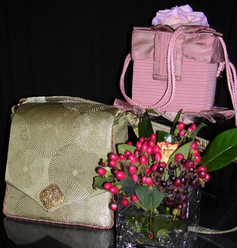 Recently added custom made handbags and accessories. We'll also remake a wedding gown or bridesmaids dress into a one-of-a-kind purse and wrap that will keep the dress living. Create something new out of something used!