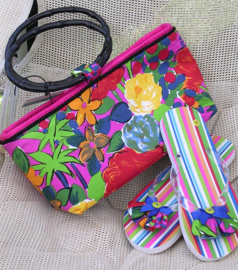 Going to a beach or outdoor party? Take along with you this cute, brightly colored Midi-tote and wear the matching embellished Flip-Flops. Add a matching fabric covered headband or hair clip. Tote is fully lined in bright hot pink satin, edged with black satin cording and finished with black oval bamboo handles. No pocket. This bag sold with Flip-Flops as set. Matching headband or hair clip, extra.