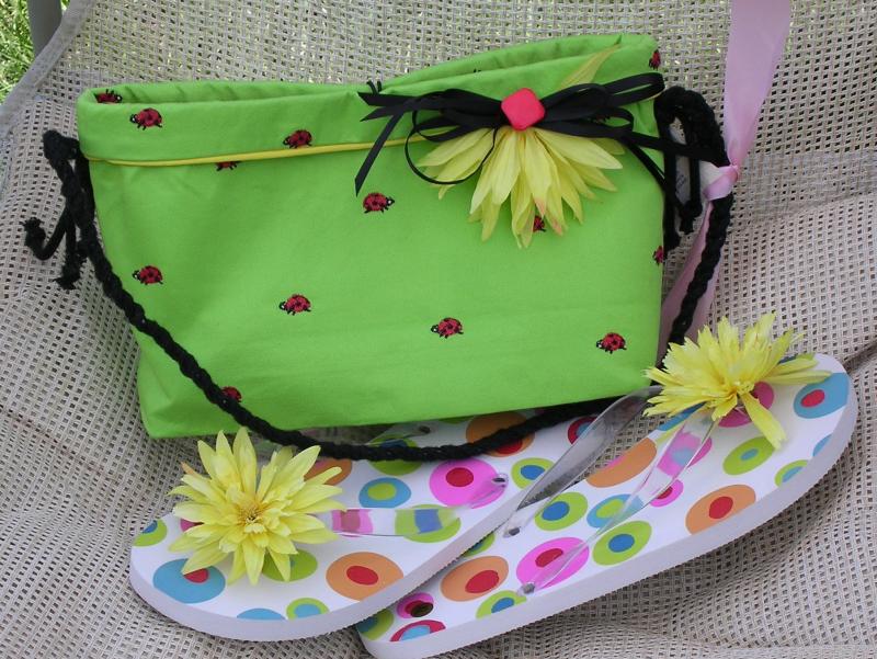 We make our mini totes from an array of fabric remnants and embellish them with silk flowers or buttons and beads. You be the designer and tell us what colors and textures you like and we'll do the rest. What about a bright green soft Mini-Tote with mini red/Black Lady Bugs!