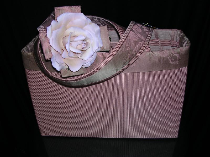 Sample maxi tote. This version includes silk trim and detachable ivory silk rose pin.