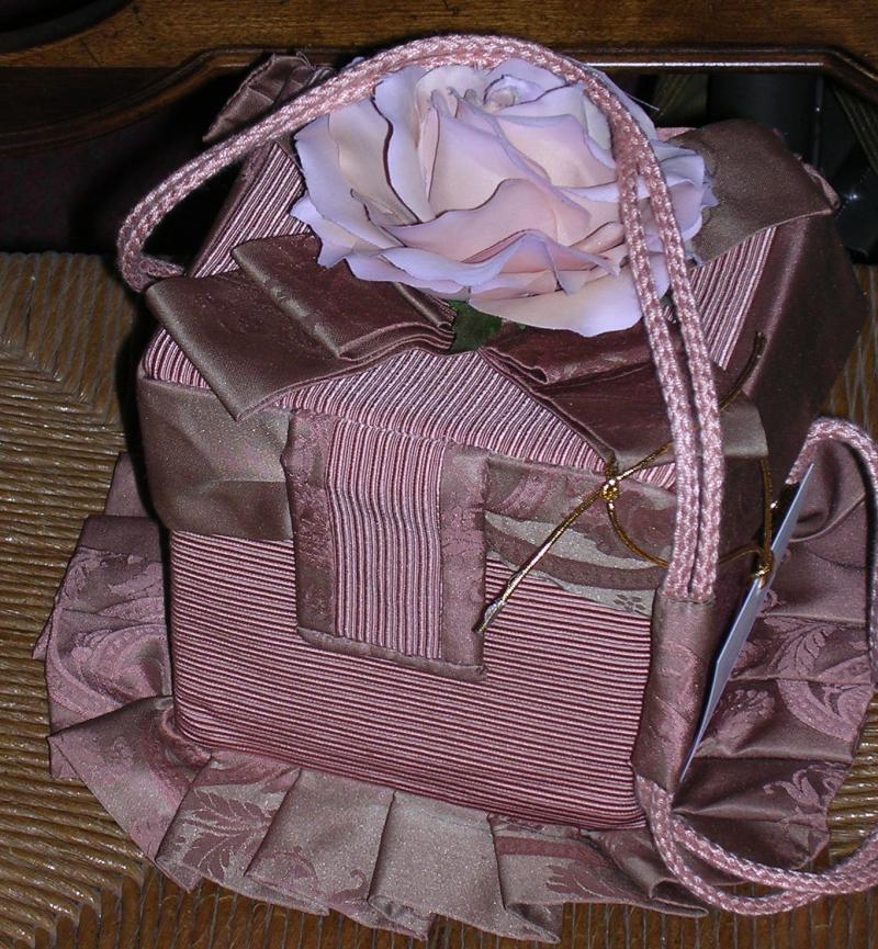 Fancy Bags: Sizes vary. Price varies based on fabric and embellishments. Made from choice fabrics and embelished with beads, silk flowers or jewlery. Please call for quote and selections.