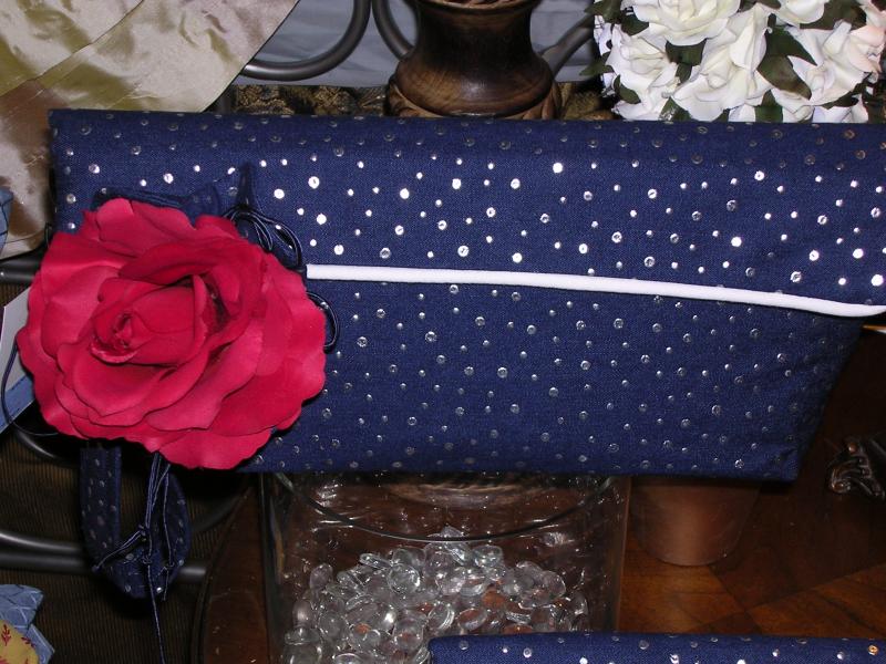 Clutch with detachable handle and red silk clip rose. Lined in red satin with magnetic closure. Made from dark blue jean fabric with silver metalic dots.